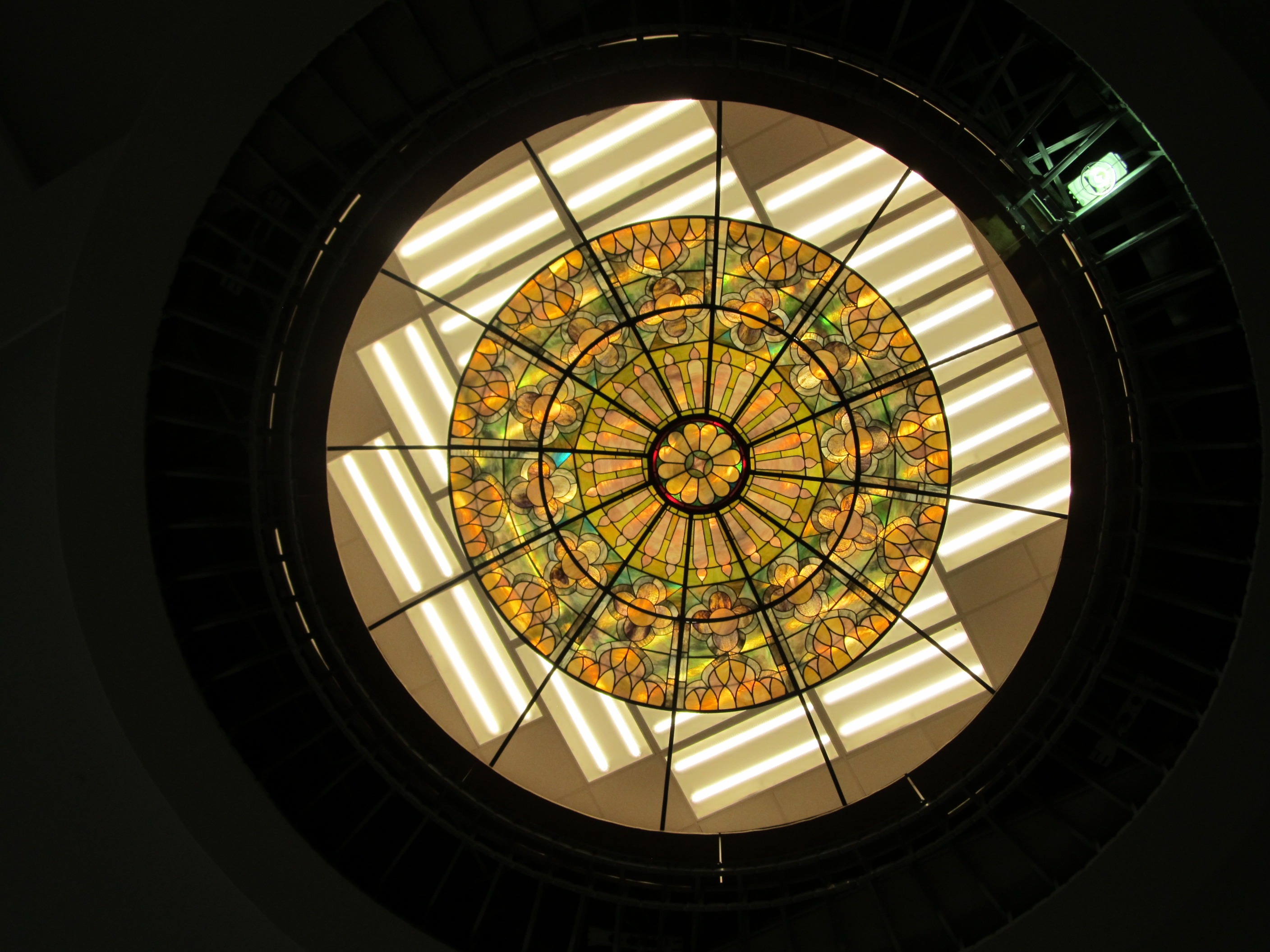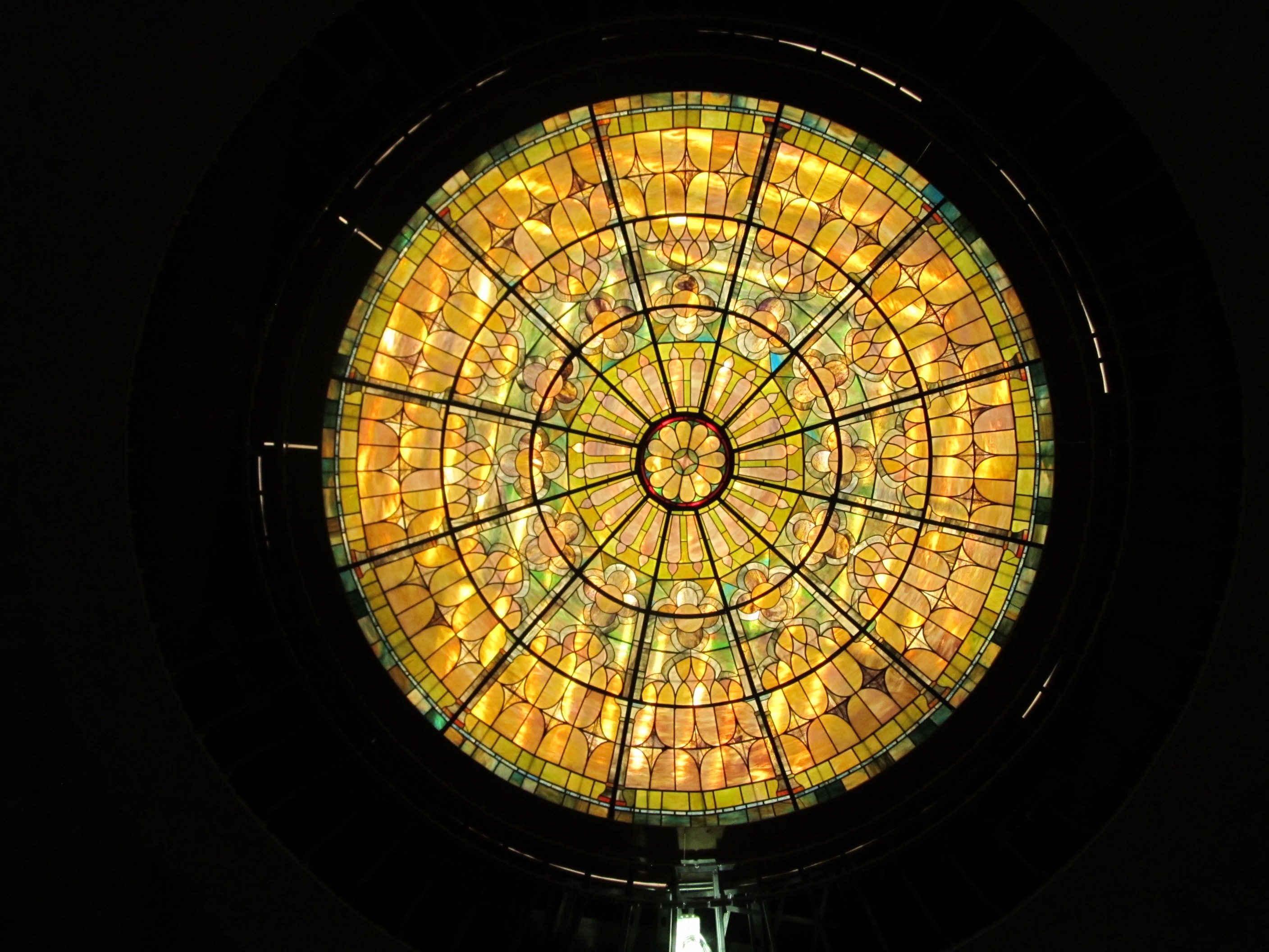 The stained glass dome we restored in Pewaukee, Wisconsin has been re-installed and it looks STUNNING. Check out the before and after! Before (without the glass, of course):